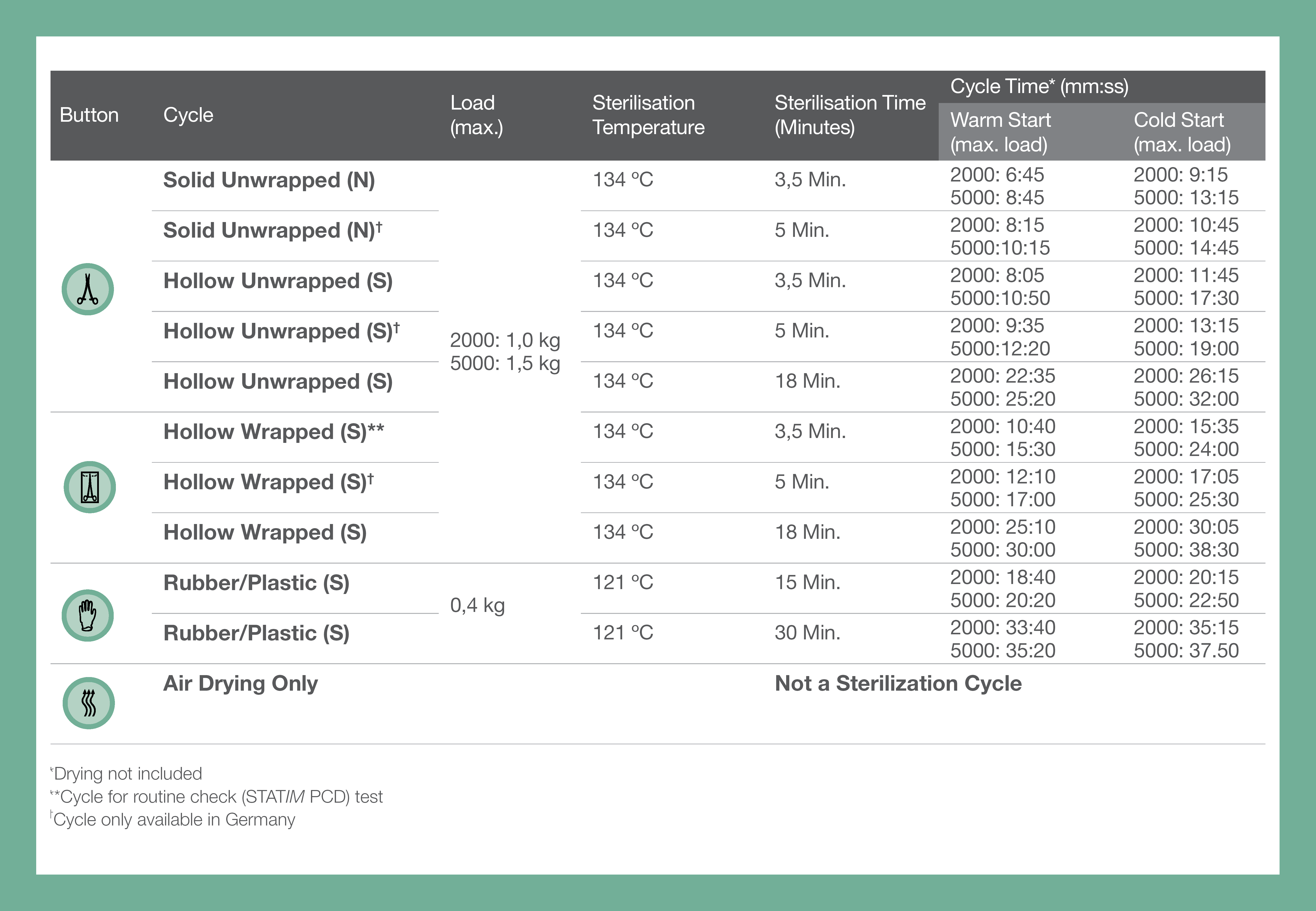 The STATIM 2000 G4 unwrapped cycle times are the world’s fastest at 6 minutes! While wrapped cycles, including drying, can be completed in as little as 35